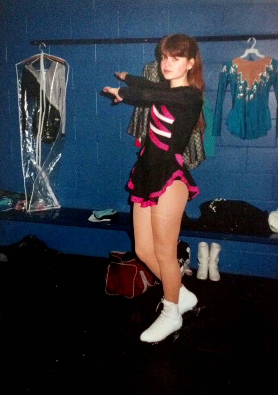 For the 1987 ice carnival, our CanSkate group was performing to “Boogie Woogie Bakery Man.” My mom was pregnant, and she recruited the help of a local seamstress. Since I was a baker, my dress was plain, clean, white satin. With zero stretch.
